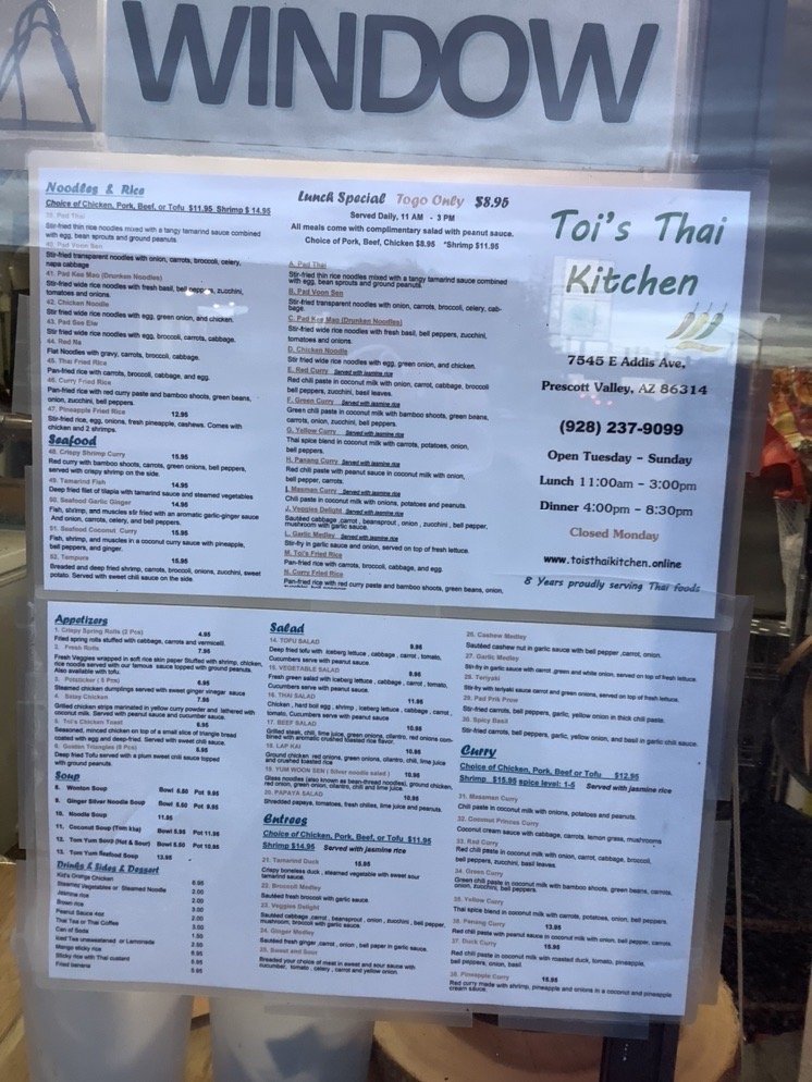 Welcome to Toi’s Thai Kitchen, a delightful gem nestled in Prescott Valley, AZ. This charming eatery is your go-to spot for authentic Thai cuisine, offering a menu brimming with delectable options. Known for its warm ambiance and impeccable service, Toi's is perfect for casual dining experiences whether you're stopping in for lunch, dinner, or takeout.